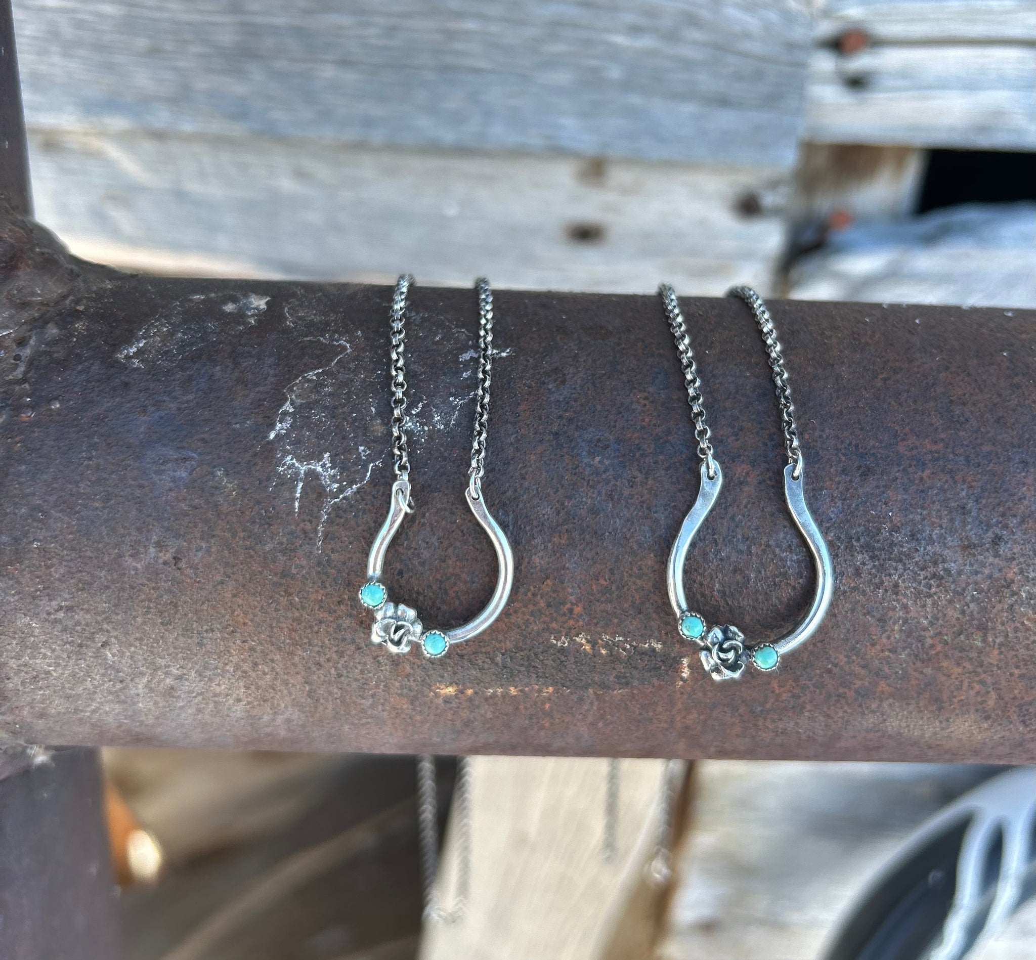 Handmade from sterling silver and set with genuine turquoise, this horseshoe-shaped ring keeper features a tiny rose detail and a sturdy chain. Just slide your rings onto the open curve and wear it around your neck while you work, cook, or get your hands dirty. It’s both pretty and practical — and a must-have for anyone who lives a little rough and still loves their sparkle.
